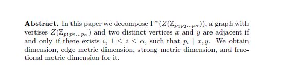 In this paper we decompose Γα(Z(Zp1p2...pα)), a graph withvertises Z(Zp1p2...pα) and two distinct vertices x and y are adjacent ifand only if there exists i, 1 ≤ i ≤ α, such that pi | x, y. We obtaindimension, edge metric dimension, strong metric dimension, and fractionalmetric dimension for it.Downloads